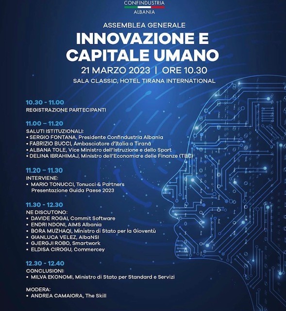 Confindustria Albania, in collaboration with Tonucci & Partner Albania, presented on Tuesday March 21st the publication ” Albania Business Guide” during the event regarding “Innovation and Human Capital” which took place at Tirana International hotel and was attended by the Embassy of Italy in Tirana and by distinguished members of the Albanian Government.