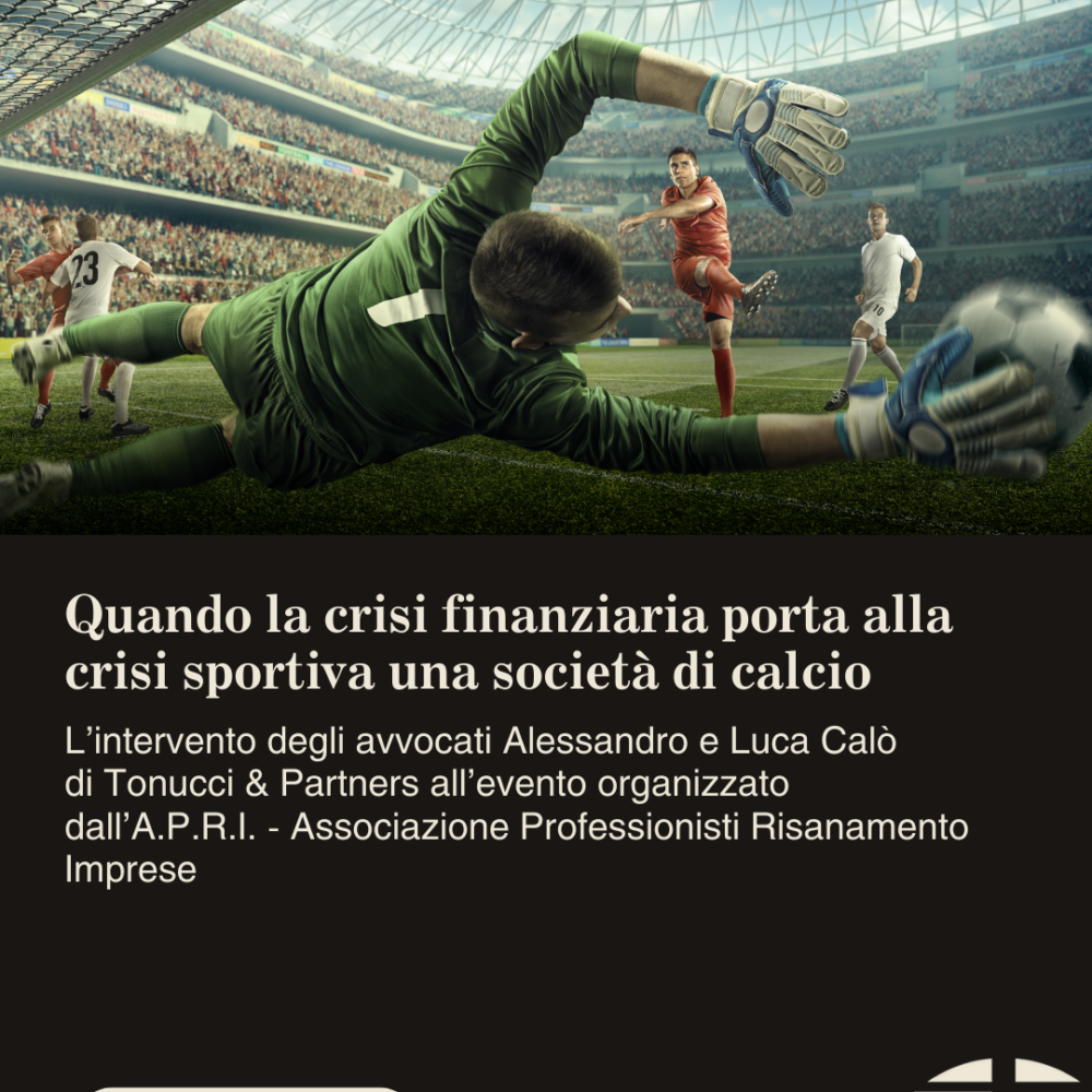 Quando la crisi finanziaria porta alla crisi sportiva una societร di calcio. L’intervento degli avvocati Alessandro e Luca Calรฒ di Tonucci & Partners all’evento organizzato dall’A.P.R.I. – Associazione Professionisti Risanamento Imprese. In un settore dove la crisi economica puรฒ rapidamente tradursi in penalizzazioni, retrocessioni o perdita dello status professionistico, 10 Febbraio 2026