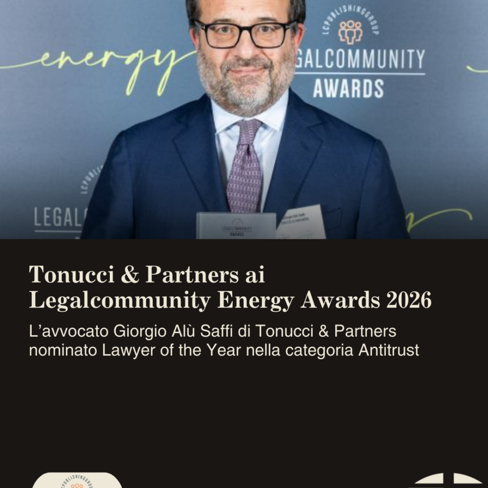 Tonucci & Partners ai Legalcommunity Energy Awards 2026. L’avvocato Giorgio Alรน Saffi di Tonucci & Partners nominato Lawyer of the Year nella categoria Antitrust. Tonucci & Partners รจ lieto di condividere che lโavvocato Giorgio Alรน Saffi di Tonucci & Partners รจ stato 2 Febbraio 2026