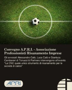 Convegno A.P.R.I. – Associazione Professionisti Risanamento Imprese. Gli avvocati Alessandro Calò, Luca Calò e Gianluca Cambareri di Tonucci & Partners intervengono all’evento “La CNC quale unico strumento di risanamento per le società di calcio”.